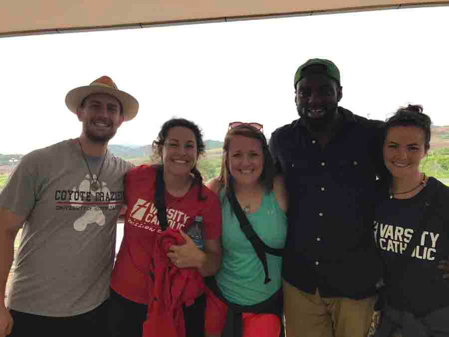 FOCUS missionaries, Josh Snow, Alexandra Rodriguez, Morgan Rolfes, Santonio Hill, and Lizzie Brenner, smile for the camera. (Courtesy Father J. Collin Poston)