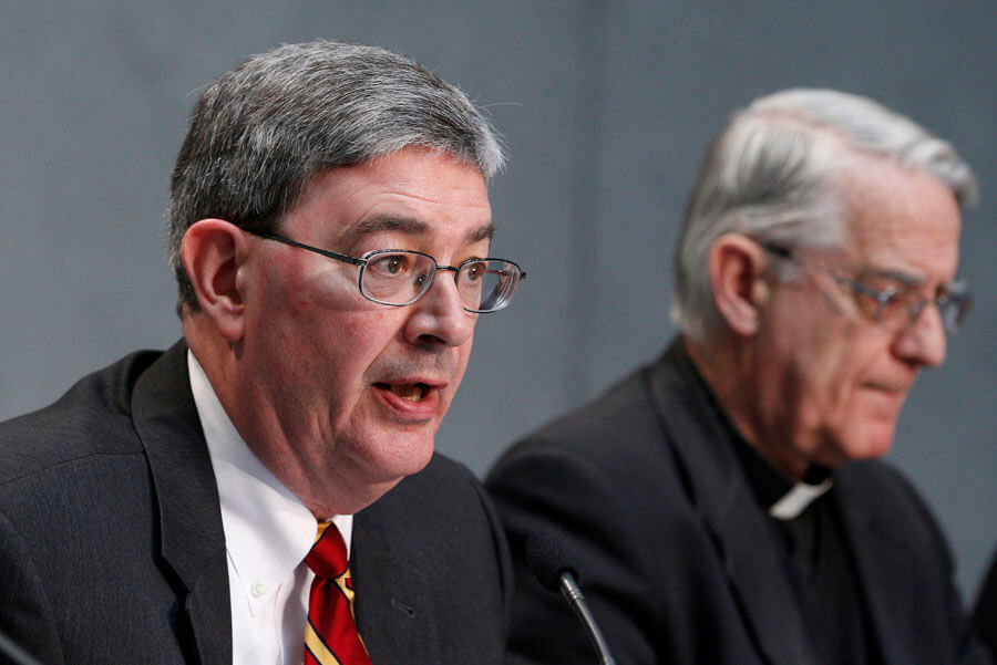 George Weigel, who wrote a biography of Blessed John Paul II, speaks at a press conference at the Vatican April 25, 2014. At right is Jesuit Father Federico Lombardi, the Vatican spokesman. (CNS photo/Paul Haring) (April 25, 2014)