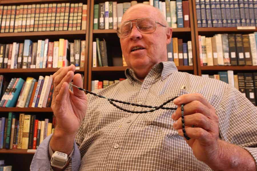 Father Milton Hipsley holds his rosary at his Mercy Ridge residence in Timonium. (CR file)