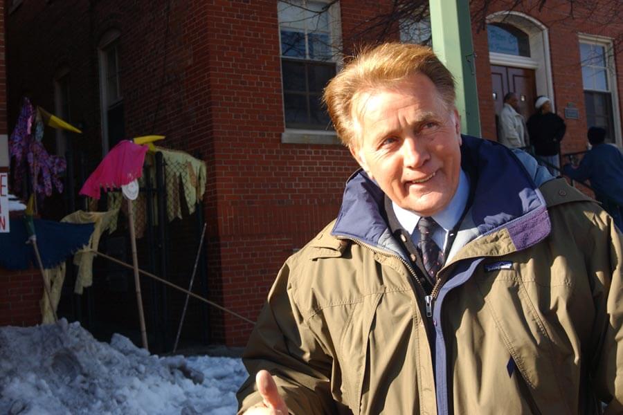 Martin Sheen arrives at St. Peter Claver Church in West Baltimore for Philip Berrigan's funeral Mass Dec. 9. (Owen Sweeney III/CR Staff)