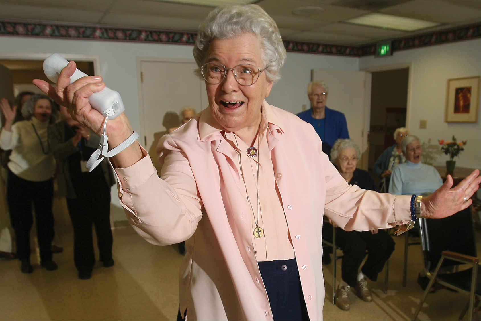Mercy Sister Lois Mueller enjoys a game of Wii bowling in this 2009 photo, taken at The Villa in Baltimore. (CR file)