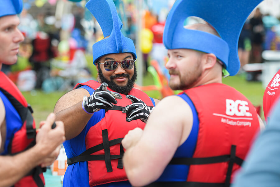 James Epps Jr., and fellow members of Team BGE wear foam shark fins to intimidate their competition at the Catholic Charities Dragon Boat Races at the Baltimore Inner Harbor Sept. 8. (Kevin J. Parks/CR Staff)
