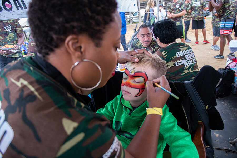 Tashia Bagwell face paints Cameron DeGrouse in the DAP Products Inc. tent, one of many teams entered in the Catholic Charities Dragon Boat Races at the Baltimore Inner Harbor Sept. 8. (Kevin J. Parks/CR Staff)