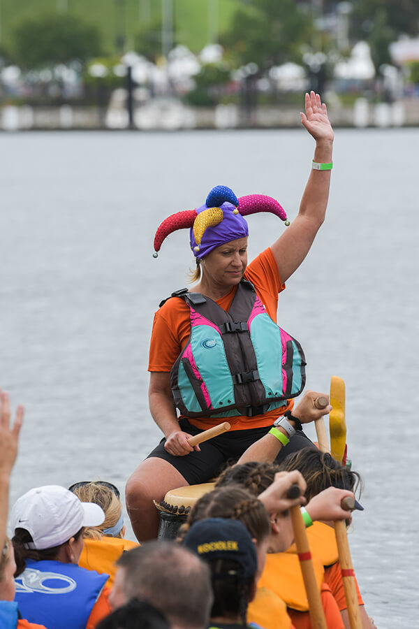 Stacey Harpine, drummer for Team Allegis Group, raises her hand to signal her crew is ready for the start of their heat at the Catholic Charities Dragon Boat Races at the Baltimore Inner Harbor Sept. 8. (Kevin J. Parks/CR Staff)