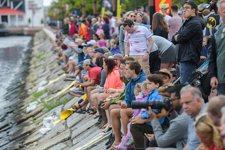 Spectators gather along the bulkhead adjacent to the Maryland Science Center to watch the Catholic Charities Dragon Boat Races at the Baltimore Inner Harbor Sept. 8. (Kevin J. Parks/CR Staff)