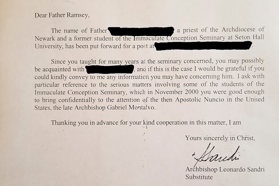 A letter dated Oct. 11, 2006 from Archbishop Leonardo Sandri, then substitute for the Vatican Secretariat of State, to Father Boniface Ramsey references a Nov. 2000 letter Father Ramsey had written to Archbishop Gabriel Montalvo, Vatican nuncio to the United States, warning about sexual abuse committed by Archbishop Theodore E. McCarrick. The letter, scanned and...