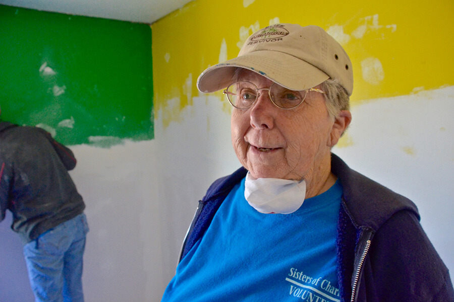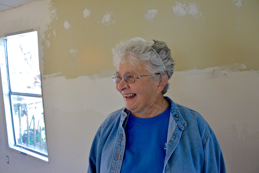Sharon Cecil, a volunteer with the Sisters of Charity of Nazareth, Ky., smiles while restoring a home flooded by the Ohio River in February. (CNS photo/Dan Stockman, courtesy Global Sisters Report)