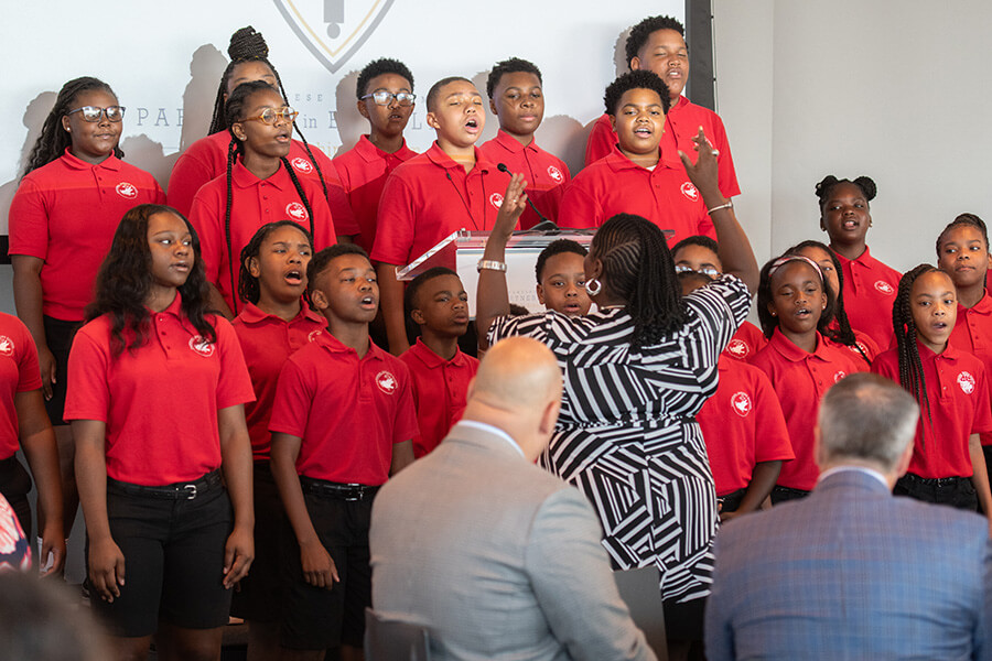 The Cardinal Shehan School choir sings the opening prayer for guests attending the Archdiocese of Baltimore’s Partners in Excellence scholarship breakfast at the Legg Mason Tower in Baltimore Sept. 6. (Kevin J. Parks/CR Staff)Read More