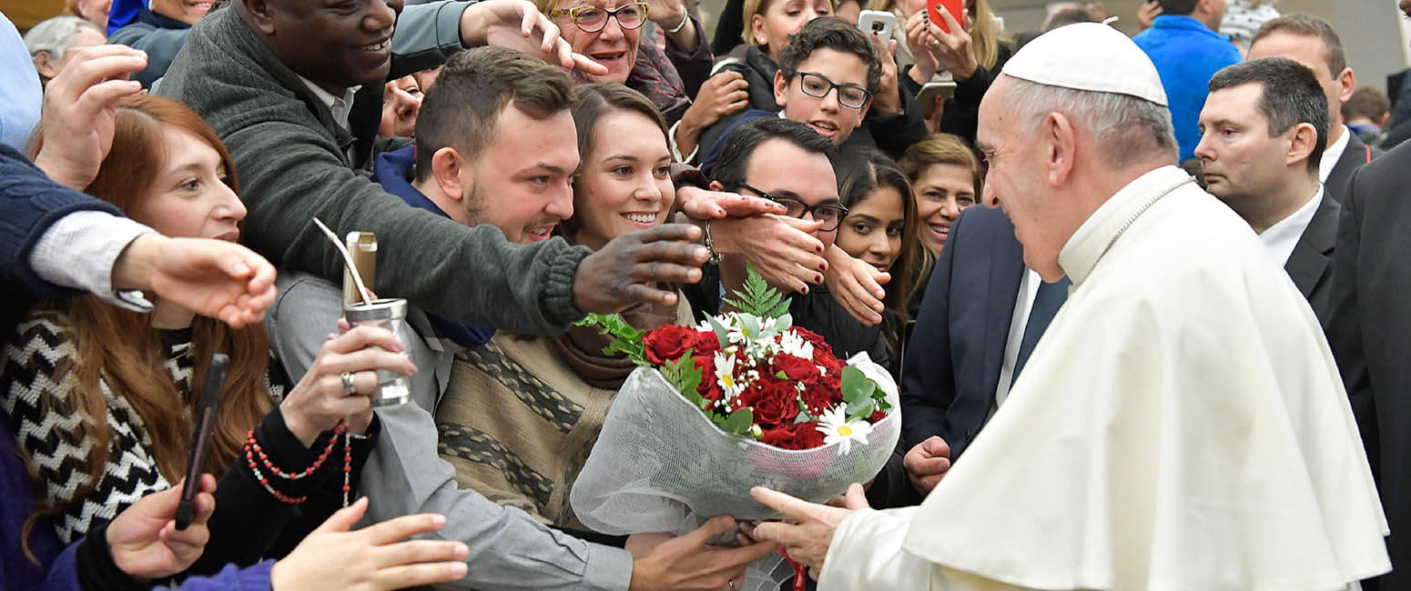 Pope Francis receives a bouquet of flowers during his general audience Jan. 3 in Paul VI hall at the Vatican. (CNS photo/L'Osservatore Romano)Read More