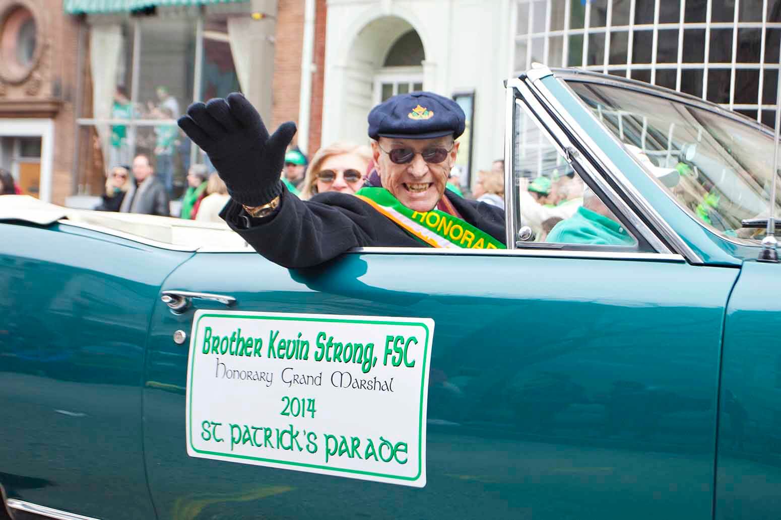 Brother Kevin Strong, honorary grand marshal of the 2014 St. Patrick Parade in Baltimore, waves to onlookers lines up along Charles Street. (CR file)Read More