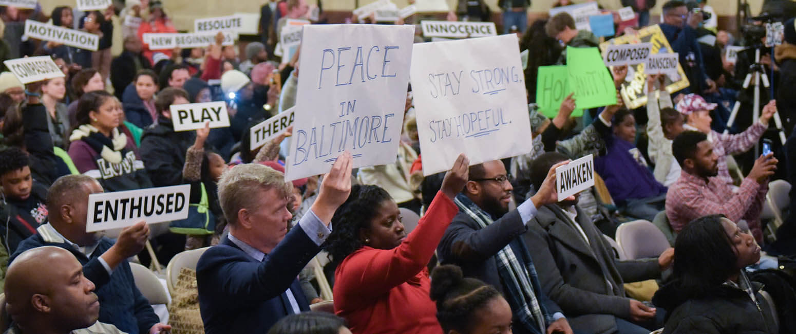 Signs are held aloft at the beginning of an interfaith prayer vigil at the War Memorial building in Baltimore Dec. 28, remembering those who fell victim to violence in the city in 2017. (Kevin J. Parks/CR Staff)Read More