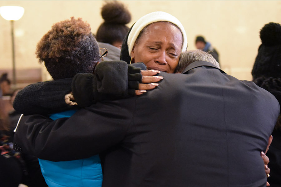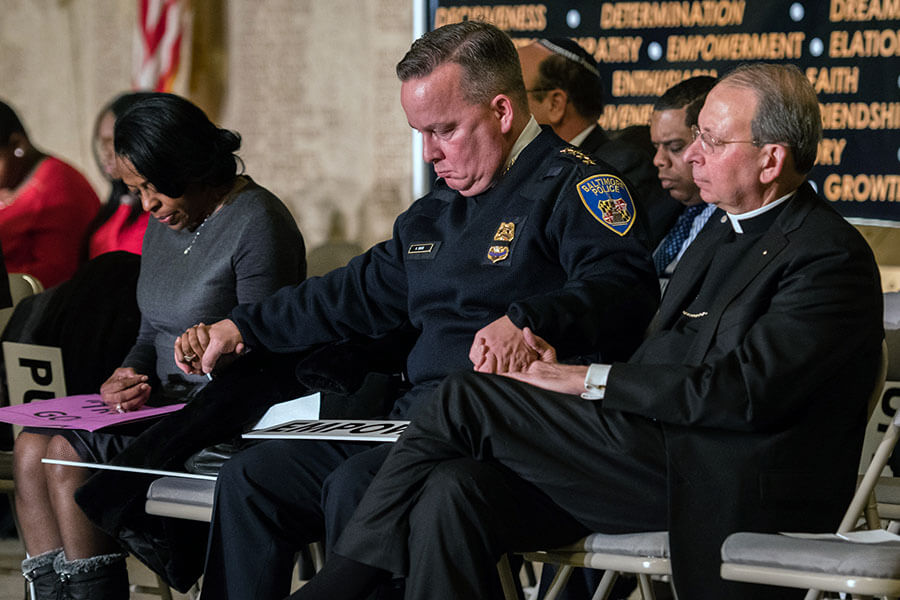 Archbishop William E. Lori, from right, Baltimore City Police Commissioner Kevin Davis and City Comptroller Joan Pratt join hands during an interfaith prayer vigil at the War Memorial building Dec. 28. (Kevin J. Parks/CR Staff)Read More