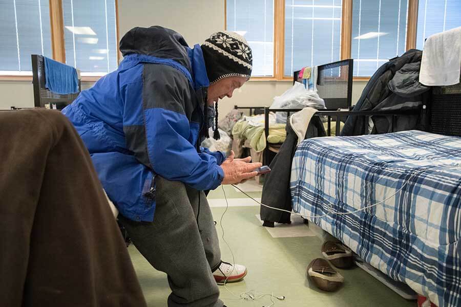 Jeff Baker, guest and volunteer resident monitor at Catholic Charities Weinberg Housing and Resource Center in Baltimore checks his phone before leaving the shelter’s sleeping area Jan 2. (Kevin J. Parks/CR Staff)Read More
