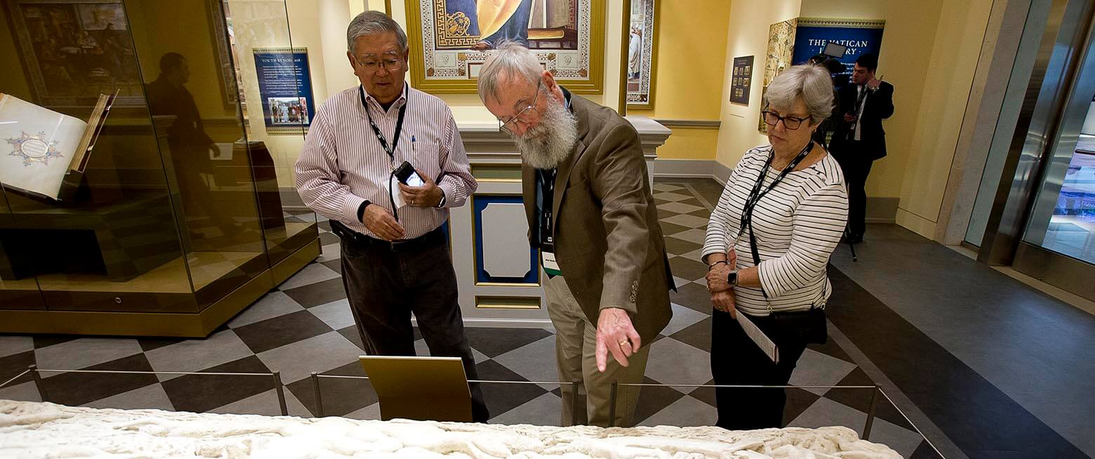 Brian Hyland, associate curator from Oklahoma City, interprets a sarcophagus replica of Jonah inside the "Vatican Museums and Vatican Library" exhibit at the Museum of the Bible in Washington Nov. 15. The original dates to about A.D. 300.(CNS photo/Tyler Orsburn)Read More