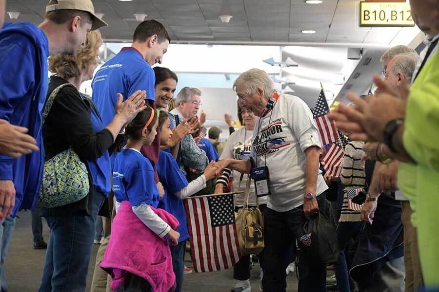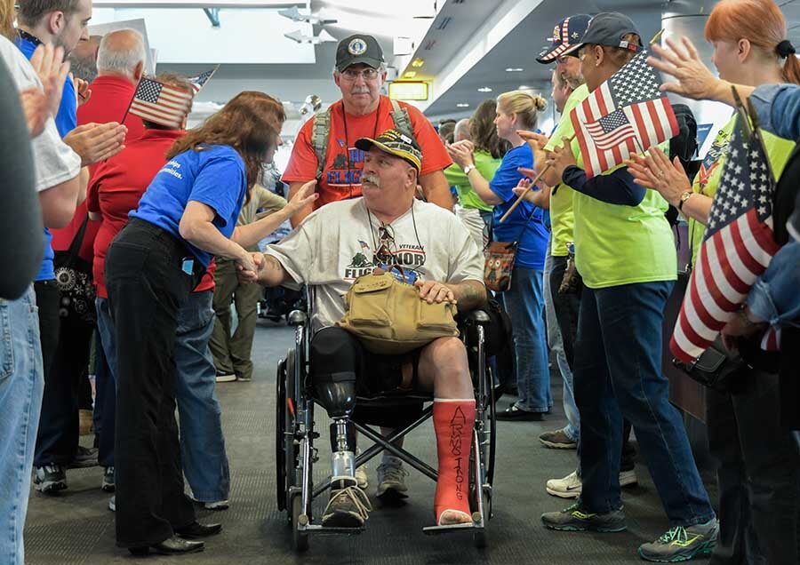 Air Force veteran Paul Shepherd pushes the wheelchair of Vietnam War Army veteran Roger Campbell through a line of well-wishers greeting Honor Flights at BWI Airport Oct. 20. (Kevin J. Parks/CR Staff)Read More