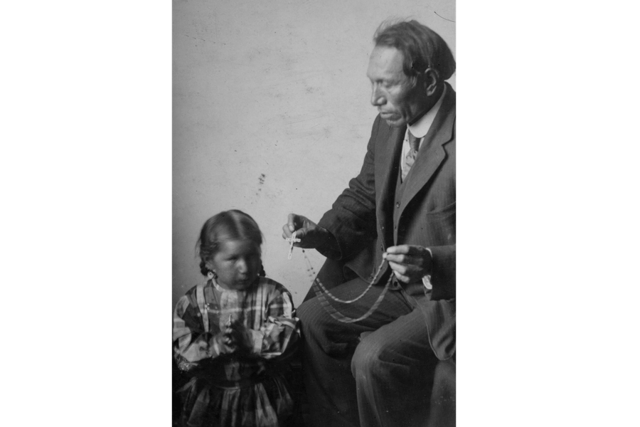 Nicholas Black Elk is pictured in an undated historical photo teaching a girl how to pray the rosary. Bishop Robert D. Gruss of Rapid City, S.D., celebrated an Oct. 21 Mass at Holy Rosary Church in Pine Ridge, S.D., to open the sainthood cause for the Native American. (CNS photo/courtesy Marquette University)Read More