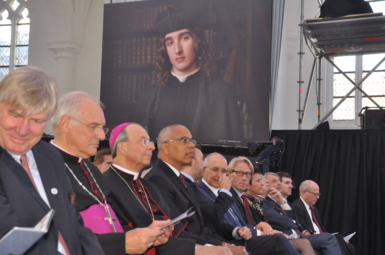 Bishop Jean-Peal Jaeger of Arras, Boulougne and Saint-Omer (second from left); Archbishop William E. Lori of Baltimore; and Maryland Lt. Gov. Boyd K. Rutherford attend the official opening of the Chapel of the Jesuits Oct. 14 in Saint-Omer, France. The former chapel will now be used as an arts and performing space. Large photographs depicting...Read More