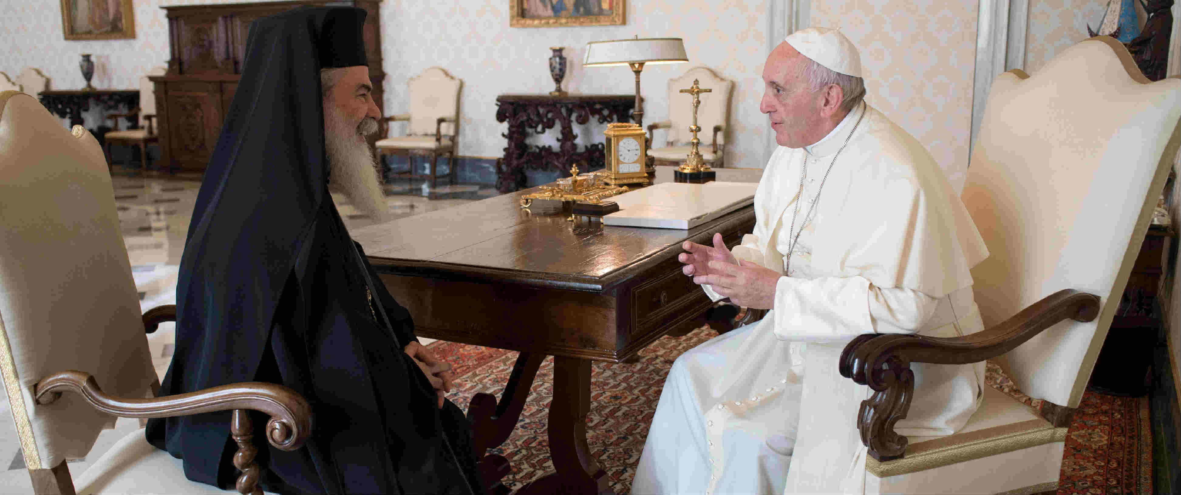 Pope Francis talks with Greek Orthodox Patriarch Theophilos III of Jerusalem during a private audience at the Vatican Oct. 23. (CNS photo/L'Osservatore Romano via Reuters)Read More