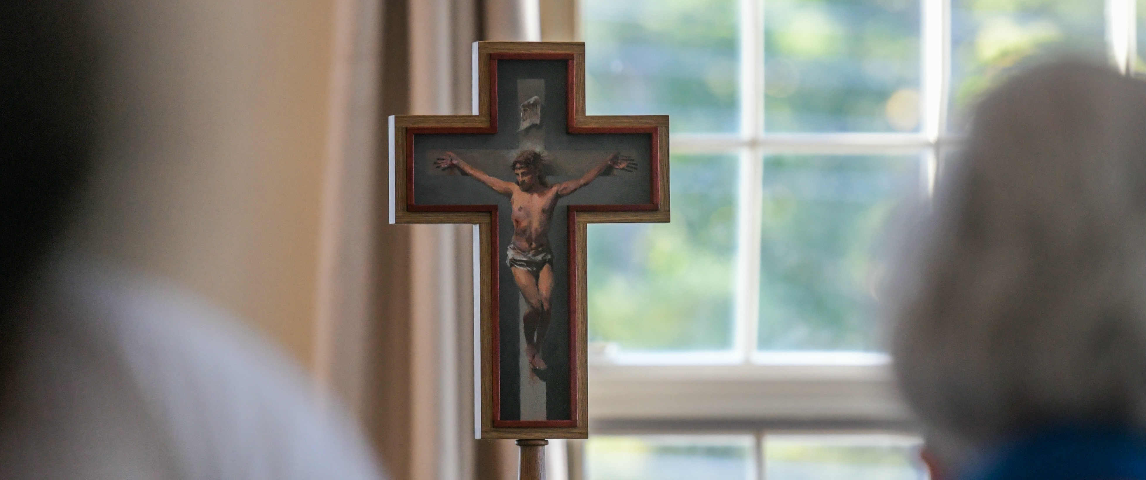 A one-of-kind handmade processional cross dedicated to the memory of former youth minister, Mark Pacione, stands prominently during a Mass and dedication in St. Joseph Hall at the Monsignor O’Dwyer Retreat House in Sparks Oct. 20. (Kevin J. Parks/CR Staff)Read More