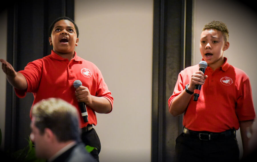 Cardinal Shehan School choir members Kai Young, left, and John Paige sing “Rise Up” to open the Archdiocese of Baltimore’s annual Partners in Excellence breakfast Sept. 6. (Kevin J. Parks/CR Staff)Read More