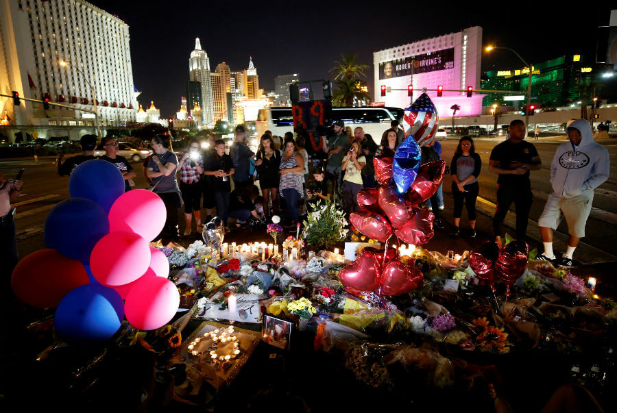 People gather at a makeshift memorial Oct. 4 for victims of a mass shooting along the Las Vegas Strip. A gunman, identified as Stephen Craig Paddock, 64, was perched in a room on the 32nd floor of a hotel and unleashed a shower of bullets on concertgoers below late Oct. 1. He killed at least...Read More