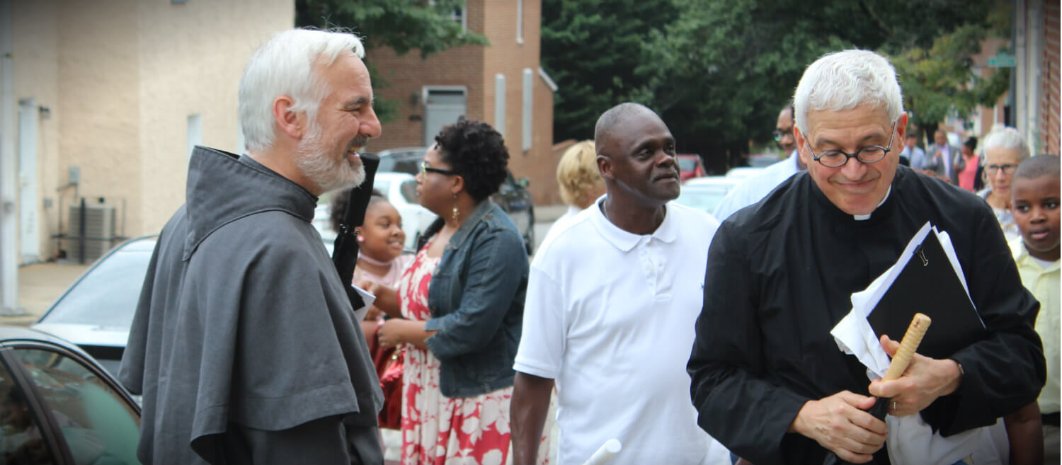 Conventual Franciscan Father Timothy Dore, pastor of St. Ann and St. Wencesclaus, left, and Jesuit Father James Casciotti, pastor of St. Ignatius, were among the clergy on a walk from the Institute of Notre Dame to St. James and John Catholic School Oct. 8, when the latter celebrated its 170th anniversary. (Brendan Reynolds/Special to the...Read More