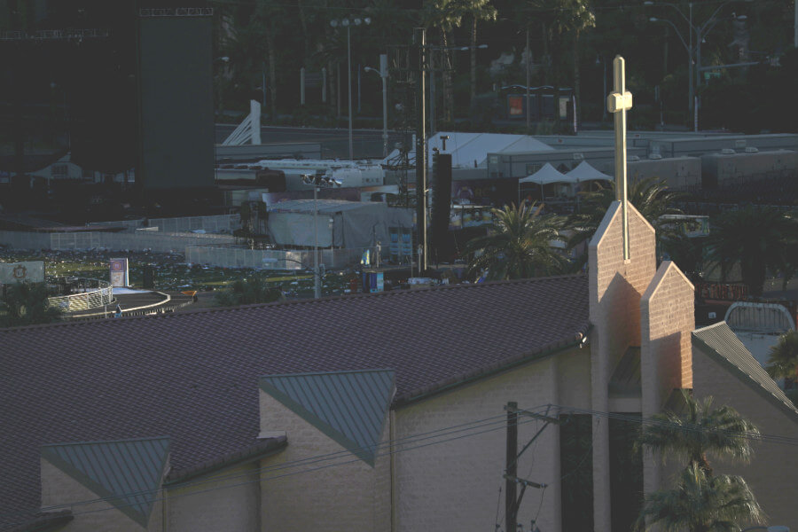 A cross is seen atop the Shrine of the Most Holy Redeemer Oct. 2 on the Las Vegas Strip near the location of a mass shooting. The church became a source of refuge after the deadly shooting that took place just across the street Oct. 1, killing at least 59 people and wounding more than...Read More