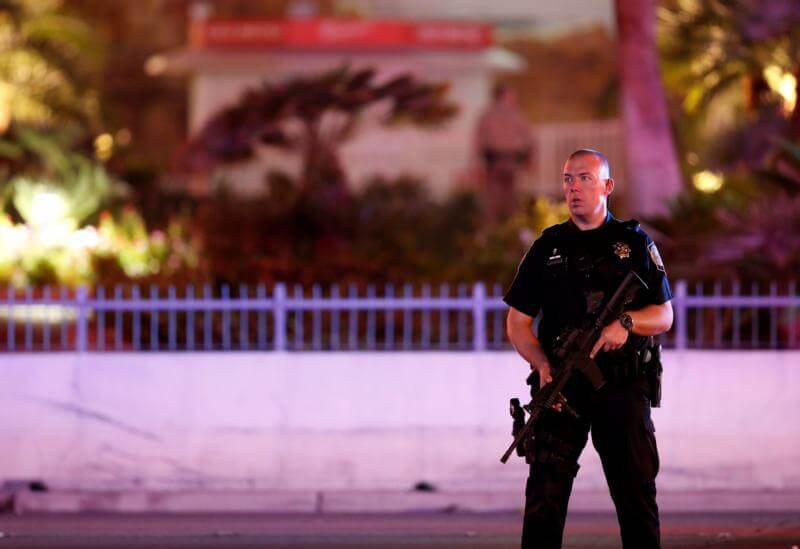 A police officer stands in front of the Tropicana hotel-casino in Las Vegas Oct. 2 after a mass shooting at a music festival. A gunman perched high on the 32nd floor of a hotel unleashed a shower of bullets late Oct. 1 on an outdoor country music festival below, killing more than 50 people and...Read More