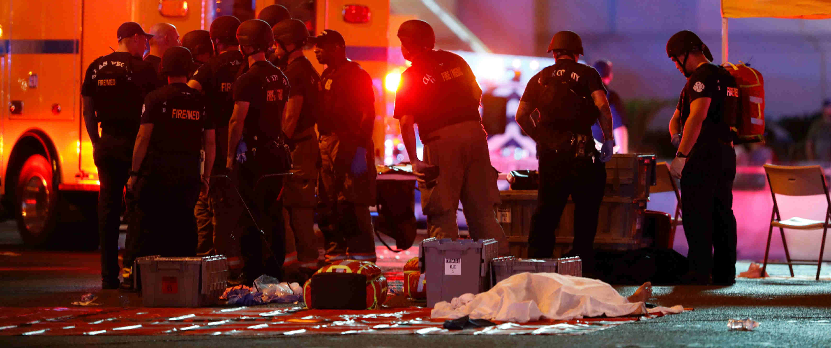 A body is covered with a sheet in the intersection of Tropicana Avenue and Las Vegas Boulevard South after an Oct. 1 mass shooting at a music festival on the Las Vegas Strip. A gunman perched high on the 32nd floor of a casino hotel unleashed a shower of bullets on an outdoor country music...Read More