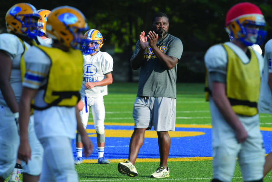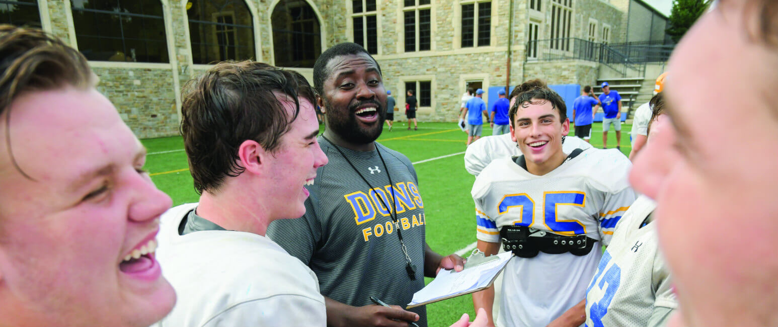 Anthony Zehyoue, an immigrant from Liberia, shares a laugh with some of his players at Loyola Blakefield, where he is the football coach. (Kevin J. Parks/CR Staff)Read More