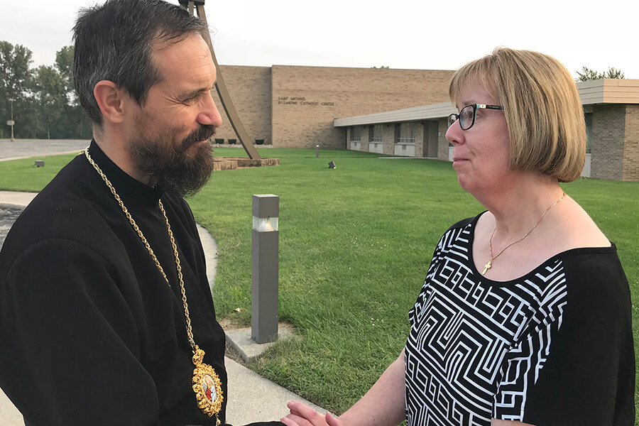 Parishioner Susan Schurg speaks with Bishop Milan Lach of the Byzantine Ruthenian Eparchy of Parma in Ohio outside St. Michael Byzantine Catholic Parish in Merrillville, Ind., Aug. 25. Schurg said she appreciated the bishop's transparency and concern for parishioners after their pastor, Father Basil Hutsko, was assaulted Aug. 20. (CNS photo/Laura Ieraci, Horizons)Read More