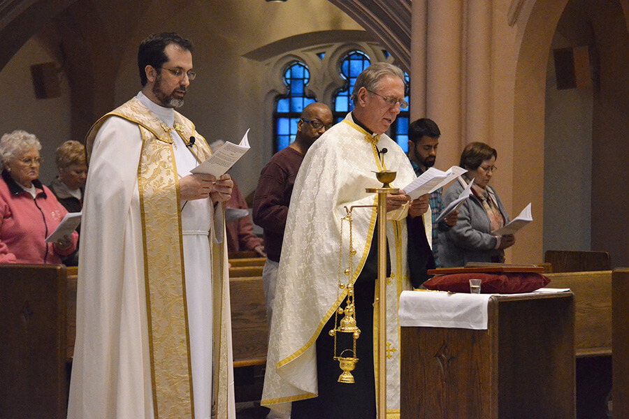 Father Mick Kopil of the Diocese of Gary, Ind., left, and Father Basil Hutsko, pastor of St. Michael Byzantine Catholic Church in Merrillville, lead a healing service in 2016 at the Cathedral of Holy Angels in Gary. Father Hutsko was attacked Aug. 20 in the altar servers' sacristy of his church and suffered a concussion...Read More