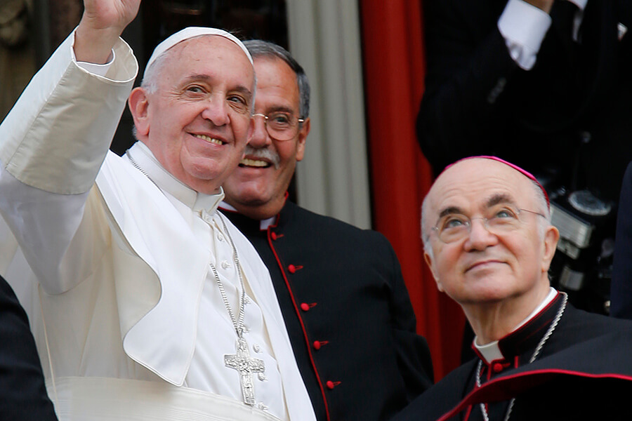 Pope Francis in 2015 waves alongside Archbishop Carlo Maria Vigano, then the apostolic nuncio to the United States, right, outside St. Patrick in the City Church in Washington. (CNS photo/Bob Roller)Read More