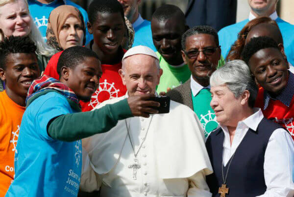 Pope Francis poses for a selfie as he greets immigrants and representatives of Caritas Internationalis during his general audience in St. Peter's Square at the Vatican Sept. 27. Caritas Internationalis was kicking off its "Share the Journey" campaign in support of immigrants. At right is Sister Norma Pimentel, executive director of Catholic Charities of the...Read More