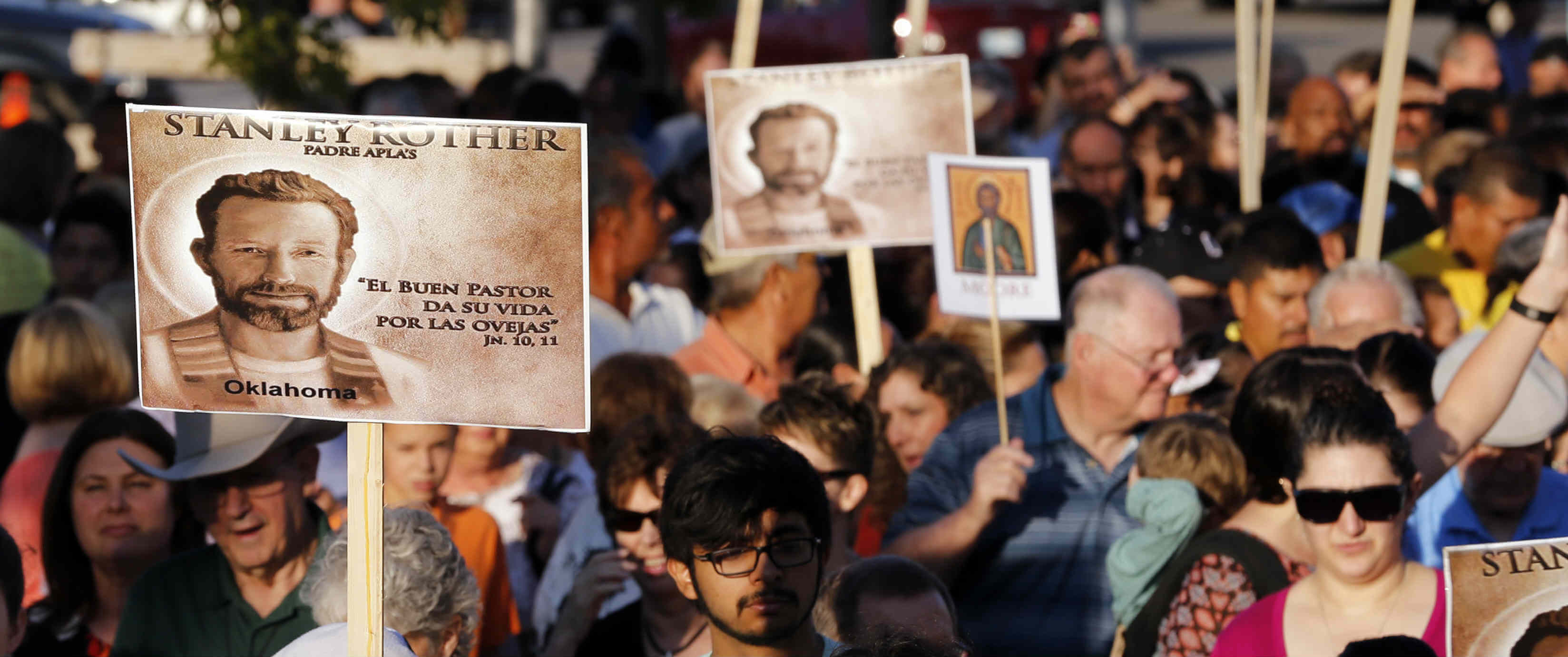 People hold placards with an image of Blessed Stanley Rother ahead of his Sept. 23 beatification Mass outside Oklahoma City's Cox Convention Center. Blessed Rother, a priest of the Oklahoma City Archdiocese, was murdered in 1981 in the Guatemalan village where he ministered. (CNS photo/Steve Sisney, Archdiocese of Oklahoma City)Read More