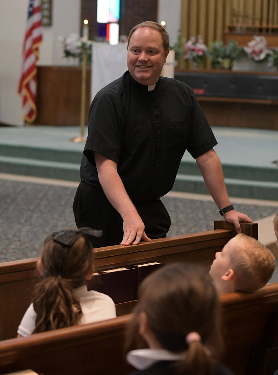 Father T. Austin Murphy Jr., pastor of Our Lady of Hope-St. Luke School in Dundalk, chats with students following an end-of-school-year Mass in May. (Kevin J. Parks Jr./CR Staff)Read More
