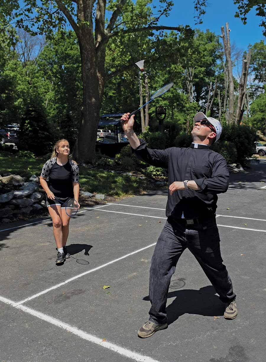 Father Ernest Cibelli plays badminton with Gabriella Tedeschi at the Antietam Recreation Center, site of field for St. Mary Catholic School in Hagerstown. (Kevin J. Parks/CR Staff)Read More