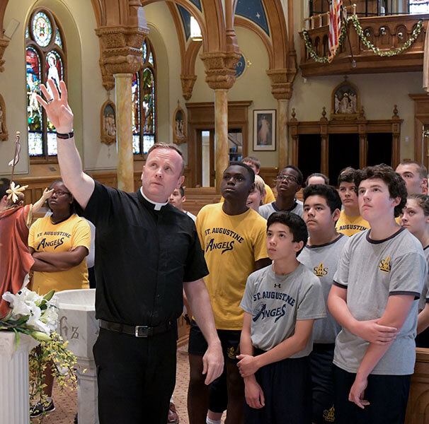 Father John Williamson, pastor of the Catholic Community of Ascension and St. Augustine, explains aspects of the sanctuary of St. Augustine in Elkridge during a church tour for eighth-grade students of St. Augustine School. (Kevin J. Parks/CR Staff)Read More