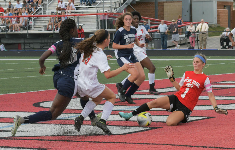 Notre Dame Prep, Towson, goalkeeper, Gabrielle Christy, makes a sliding save against Archbishop Spalding High School’s Lauren Korsnick during a match in Severn, Sept. 12. (Kevin J. Parks/CR Staff)Read More