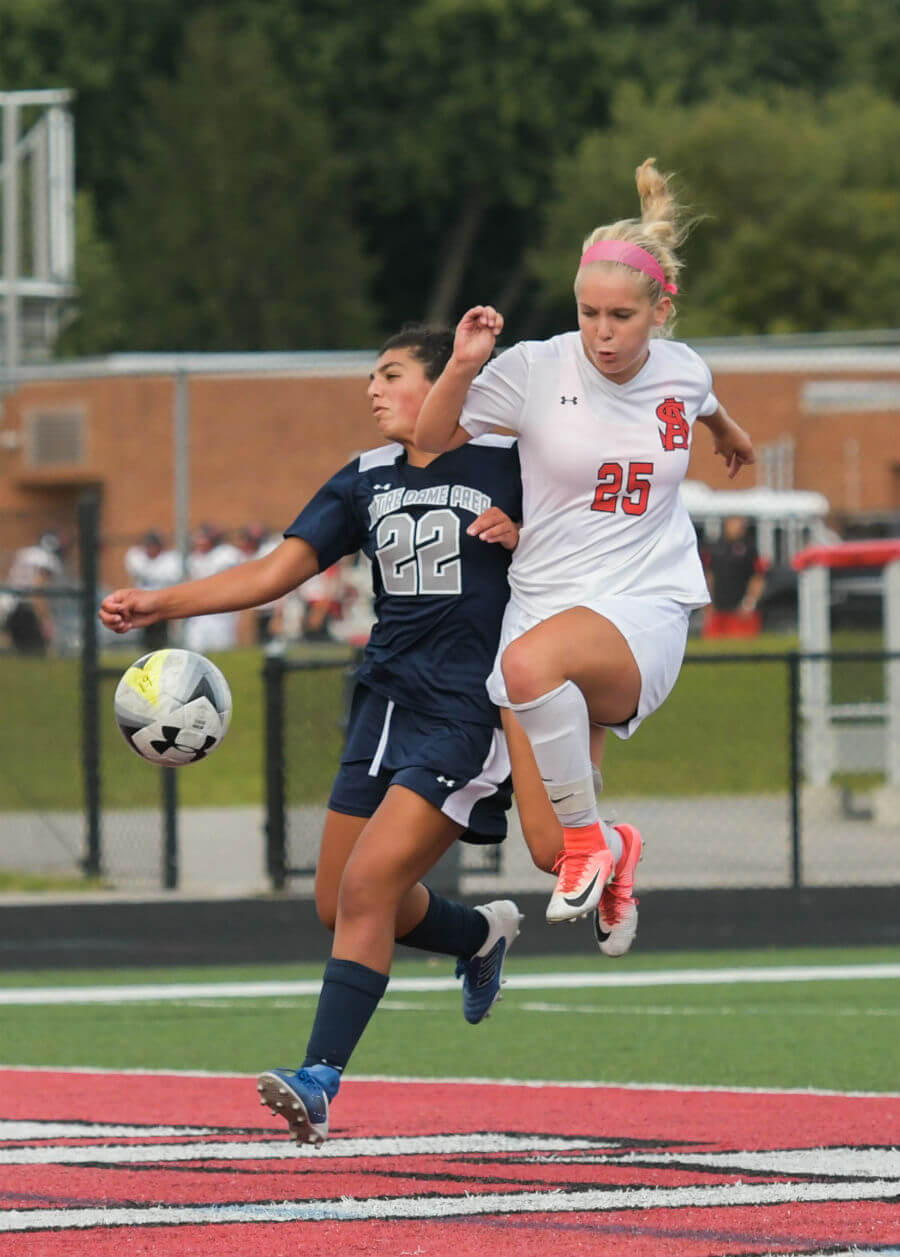 Archbishop Spalding’s Jenna Snead redirects a corner kick against Notre Dame Prep’s, Alex Fava, to score the lone goal in a 1-0 victory at home in Severn, Sept. 12. (Kevin J. Parks/CR Staff)Read More