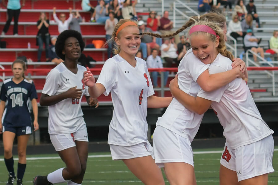 Archbishop Spalding’s Jenna Snead, right, hugs teammate, Kaitlyn Keaton, following their goal and assist respectively, during a varsity soccer match at home against Notre Dame Prep, Sept. 12. The Cavaliers won the game 1-0. (Kevin J. Parks/CR Staff)Read More