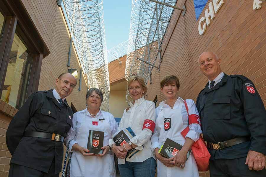 Local parishioners and Order of Malta members, from left, Patrick Wlash, Julia Stamero, Charlotte Ponticelli, Mary Hosford and Rob Rogers pause outside the Chesapeake Detention Center in Baltimore City, where the Gospel is shared with inmates as part of the order's prison ministry. (Kevin J. Parks/CR Staff)Read More