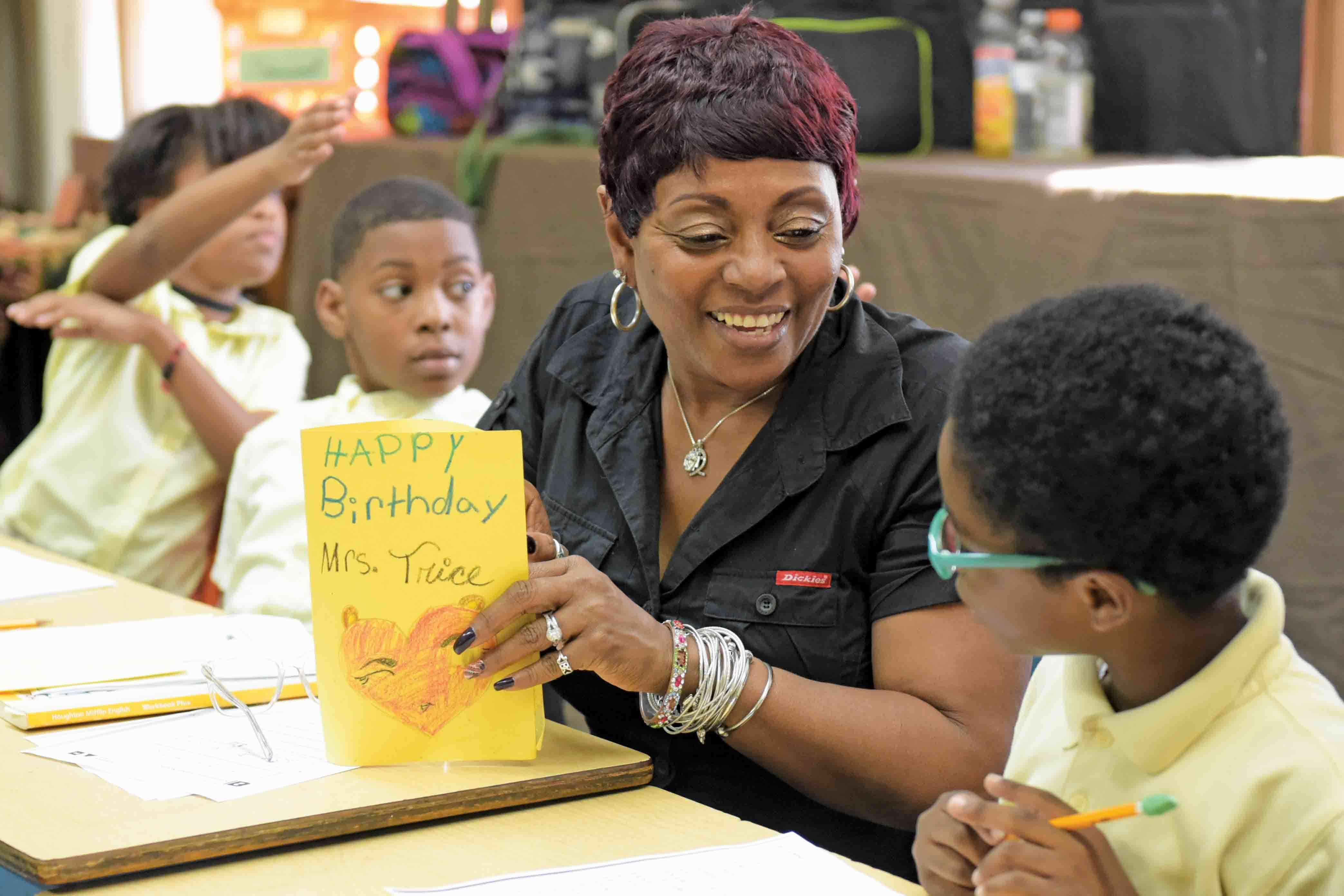 Charmaine Trice shows third-grader Ronald Berry a birthday card she received from a former Ss. James and John Catholic School student. (Kevin J. Parks/CR Staff)Read More