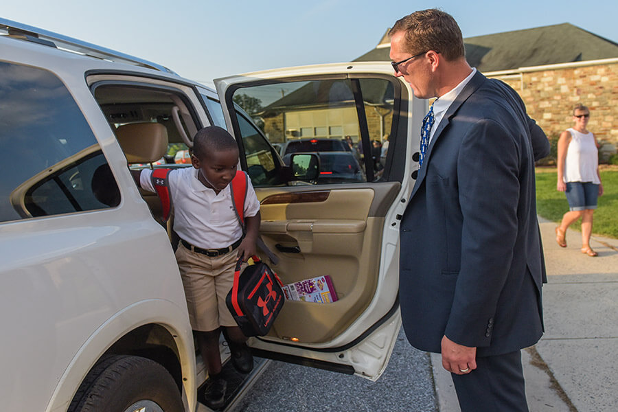 Kenneth Pipkin, principal of St. Joseph School in Fullerton, holds the door for Alvin Mwangi, a fourth-grader at the school, Sept. 5. (Kevin J. Parks/CR Staff)Read More