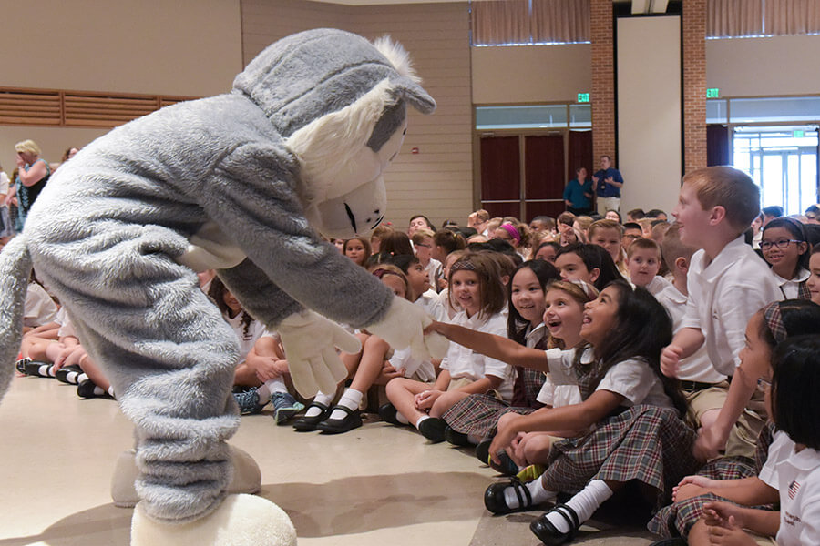Anjuli Jagadesan shakes the hand of the school’s new wolf mascot prior to the student’s opening assembly at St. Joseph School, Fullerton, Sept. 5. (Kevin J. Parks/CR Staff)Read More