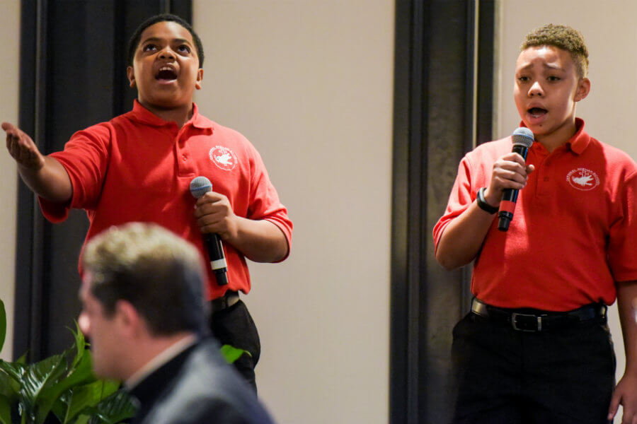 Cardinal Shehan School students, Kai Young, left, and John Paige, sing “We Will Rise Up”, to open the Archdiocese of Baltimore’s annual Partners in Excellence breakfast Sept. 6. (Kevin J. Parks/CR Staff)Read More