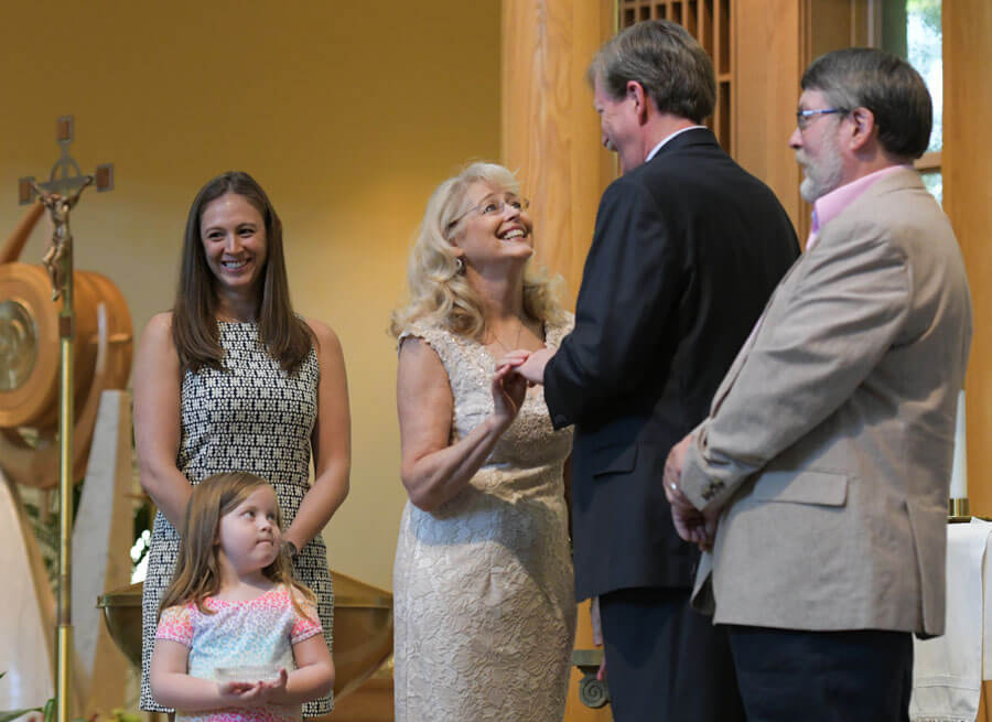 Lynn Thomas and Brian Yeatman exchange wedding vows during weekend Mass at St. Andrew by the Bay in Annapolis Aug. 19. Thomas’ daughter, Chelsea Smith, and Yeatman’s brother, Richard Yeatman Jr., were witnesses. Pastor Father Jeffrey S. Dauses celebrated the Mass, and invited parishioner, Kaitlyn Pioro, to be the impromptu ring bearer. (Kevin J. Parks/CR...Read More