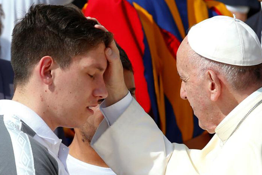 Pope Francis blesses Jackson Follmann of the Brazilian Chapecoense soccer team as the pontiff arrives for his weekly audience Aug. 30 in St. Peter's Square at the Vatican. The pope met with Follmann and two other soccer players, who survived a 2016 airplane crash that killed their teammates. (CNS photo/Tony Gentile, Reuters)Read More