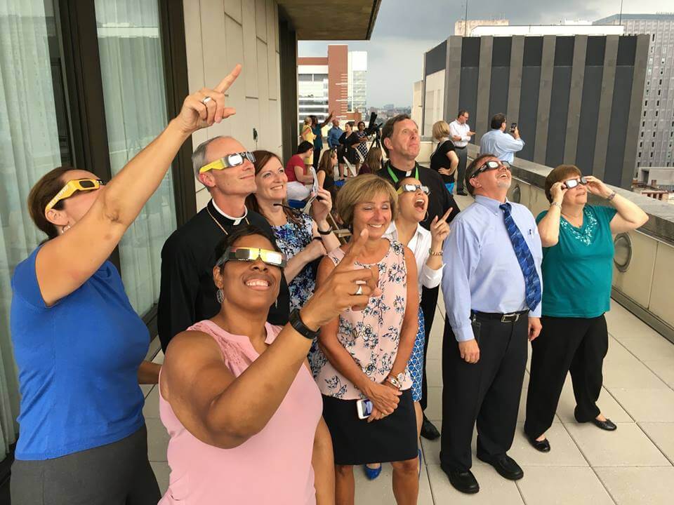 Several employees of the Archdiocese of Baltimore stand at the top of the Catholic Center in Baltimore to observe the Aug. 21 solar eclipse. (Kevin J. Parks/CR Staff)Read More