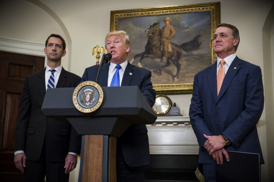 U.S. President Donald Trump makes an announcement on the introduction in the Senate of the Reforming American Immigration for Strong Employment Act, or RAISE, with Sens. Tom Cotton, R-Ark., and David Perdue, R-Ga., at the White House Aug. 2.Read More